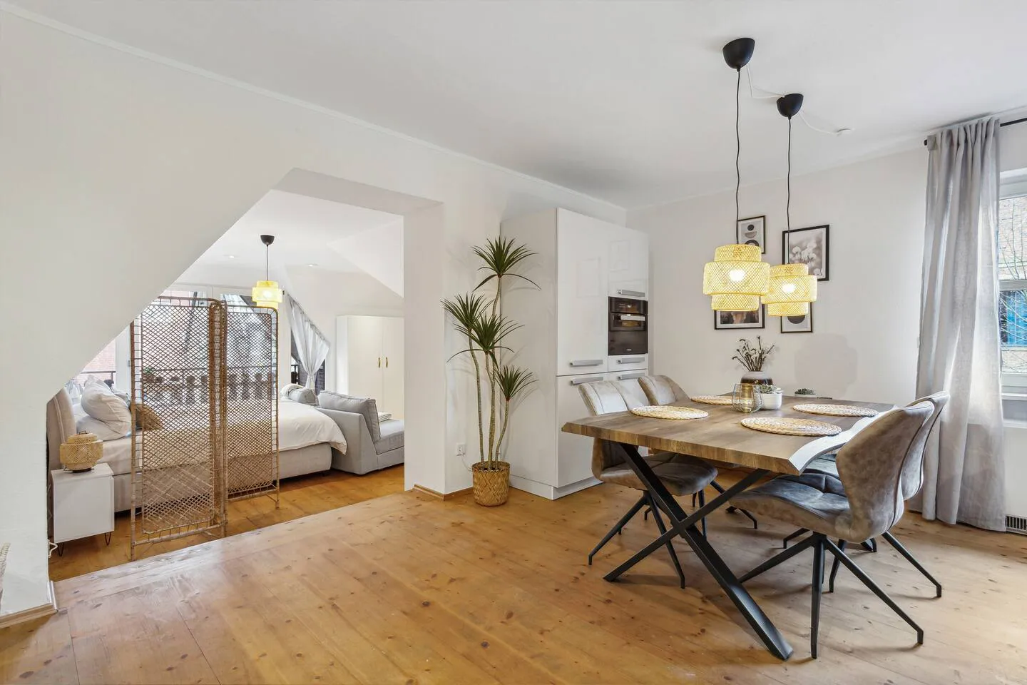 Diese charmante, komplett renovierte Wohnung verbindet modernes Design mit historischem Flair und bietet Ihnen den perfekten Rückzugsort. Die geräumige und lichtdurchflutete Küche lädt zu gemütlichen Kochabenden ein, während der Essbereich mit seinem warmen Holzfußboden und der stilvollen Einrichtung für gesellige Stunden sorgt.