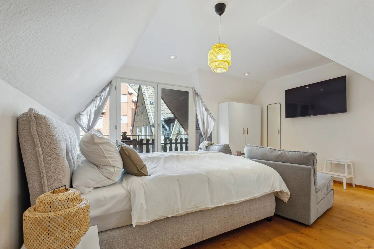 Das Schlafzimmer bietet Ihnen einen gemütlichen Rückzugsort, der mit einem komfortablen Bett und einem Balkon ausgestattet ist, von dem aus Sie den Charme des Viertels genießen können. Für sonnige Stunden lädt der Balkon zu entspannten Momenten im Freien ein.